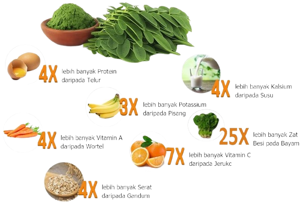 Kelor Mengandung 30% Protein, 48% Karbohidrat dan 90% Nutrisi berupa vitamin, mineral, phytonutrien, protein, klorofil, 36 anti-inflamasi, 18 asam amino (8 di antaranya esensial) dan 46 antioksidan kuat, senyawa yang melindugi tubuh terhadap efek merusak dari radikal bebas.